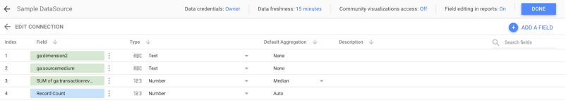 After creating a new data source and importing the Google sheet with the Pivot Table, we need to modify the aggregation type for the transaction revenue. This is done in order to view the MEDIAN CLV per channel.