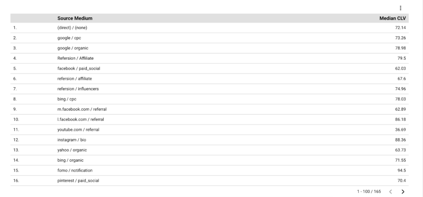 When creating the chart in Looker Studio, just add Source Medium as a dimension and Transaction Revenue to the Metric section. The results should look like this, showing the MEDIAN CLV per traffic source. If you wish to view the CLV per Channel, repeat the process but instead of Source/Medium use the Default Channel Grouping dimension from Google Analytics.