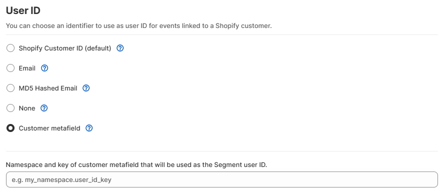 When you select this setting, no userId will be sent on client-side events because Customer metafields can’t be accessed from the web page.
