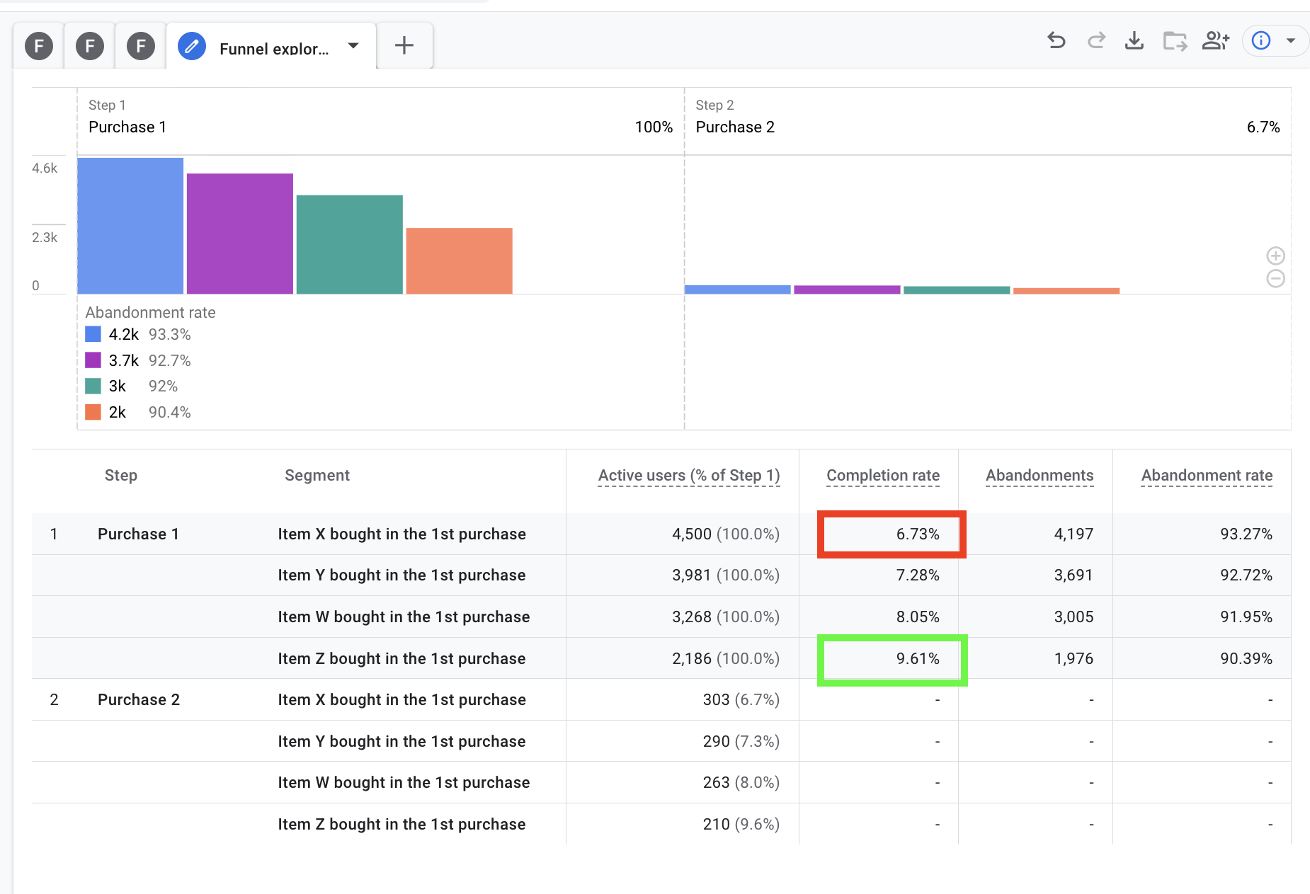 We created a two-step purchase funnel to compare users across four different products bought in their first purchase.