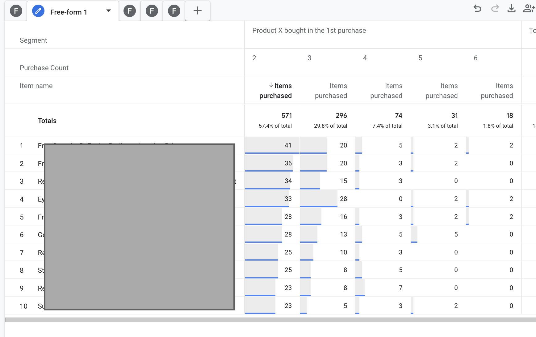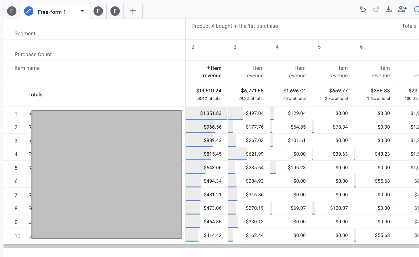 By comparing these four segments, we can see exactly which product has the highest "Repeat Purchase" success. If Product Z has a 9.61% follow-up purchase rate while Product X only has 6.73% but makes it up with a higher volume - it’s up to you to choose where to put your ad spend.