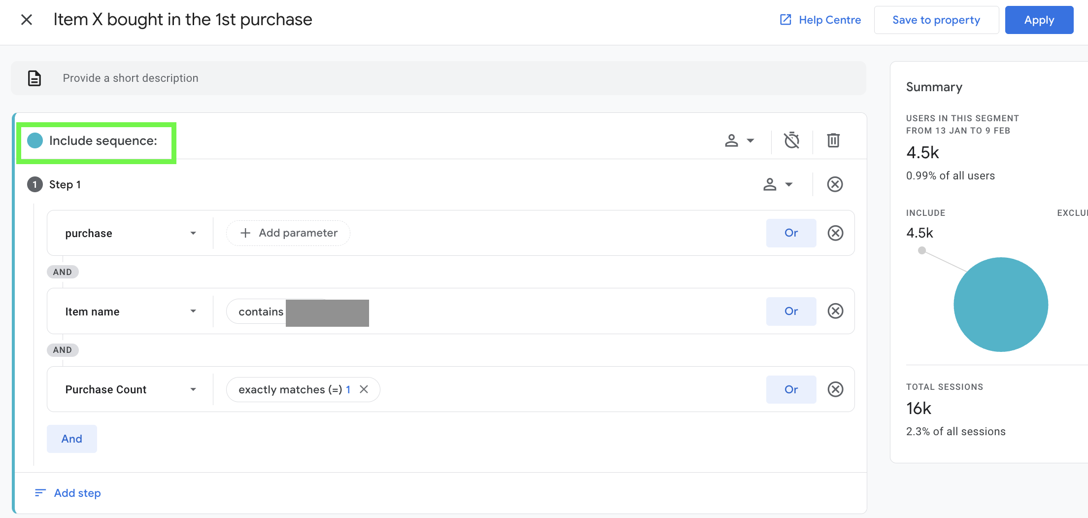 Let’s create a GA4 segment of users who purchased a specific product in Order #1: