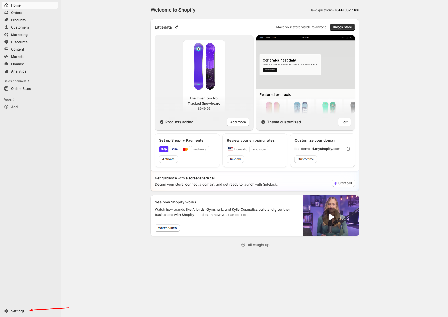 - Go to your Shopify admin, click on Settings, bottom left of the page: