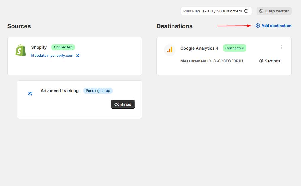 From the Littledata dashboard, click the Add destination button in the top right of the page.