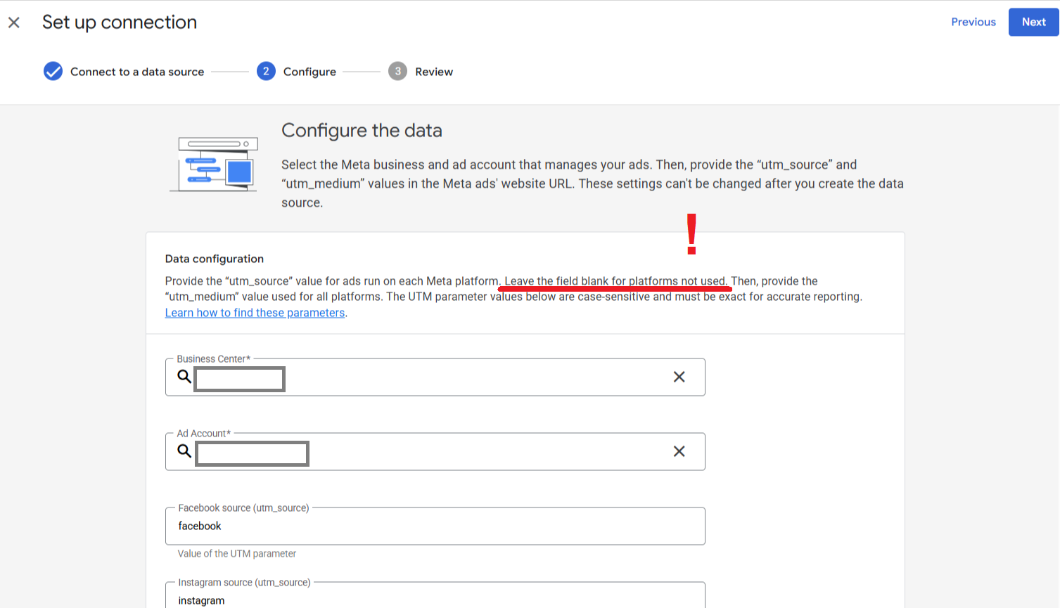 The next step involves mapping your Meta ad parameters to the standard GA4 dimensions for accurate data alignment. GA4 will prompt you to define the utm source and utm medium values used for your Meta ads. This mapping is essential for matching the imported cost data with the corresponding sessions already recorded in GA4.