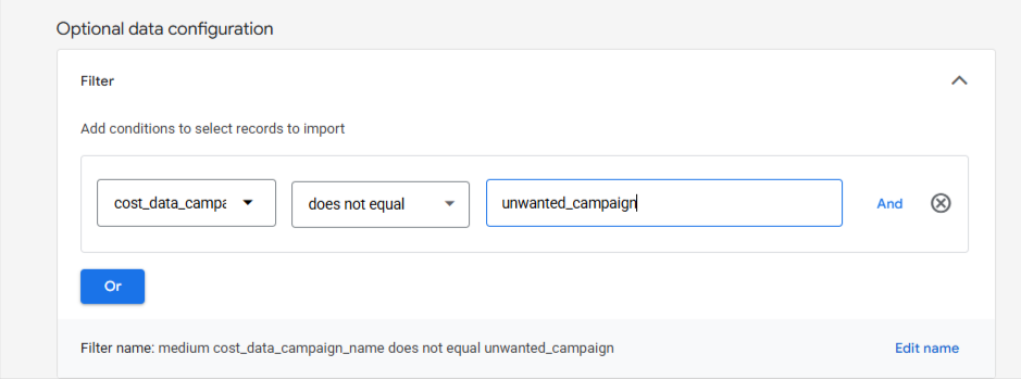 This feature allows you to apply a filter to exclude specific campaigns from the cost import. For instance, you can define a filter to exclude campaigns containing a specific phrase in their name, like we did for the sake of this demo.