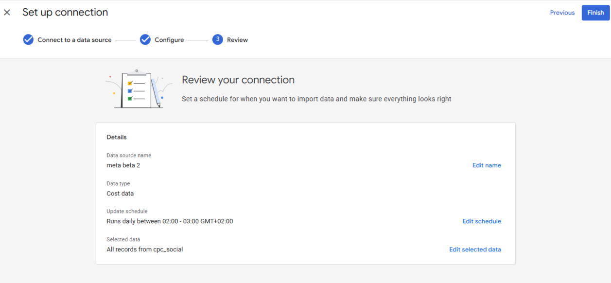 Once the data source is named, you will be prompted to log in to your Facebook Business Manager to select the specific ad account you wish to connect.