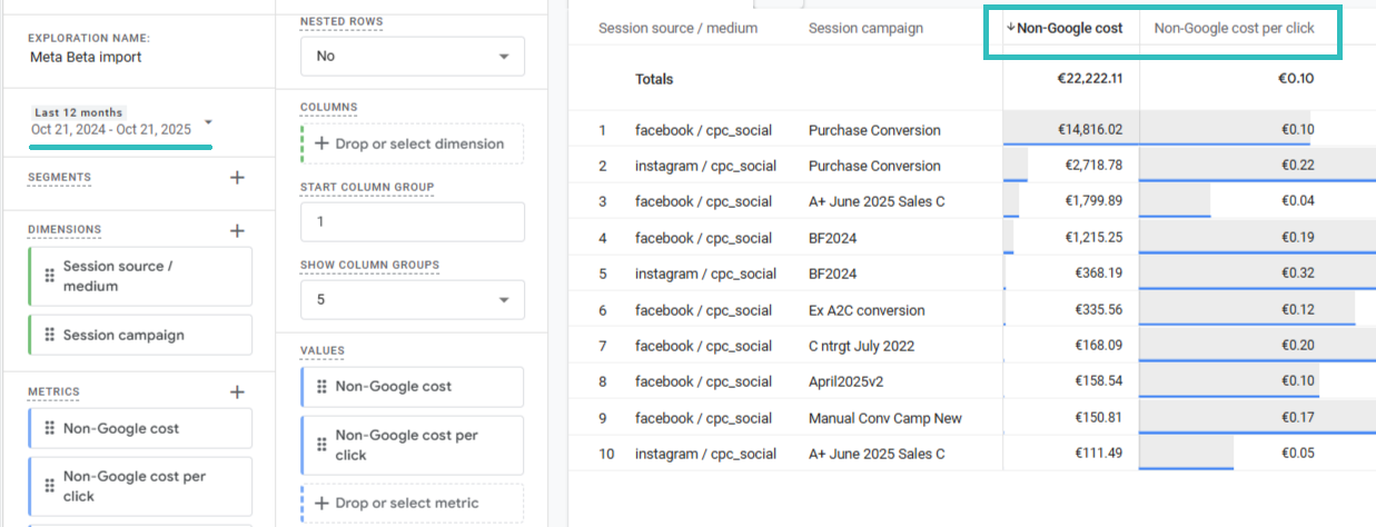 The key advantage of this connector is its ability to import historical cost data. The feature typically pulls data going back as far as the data is available in your Meta account, which can extend up to 14 months within the GA4 exploration reports.