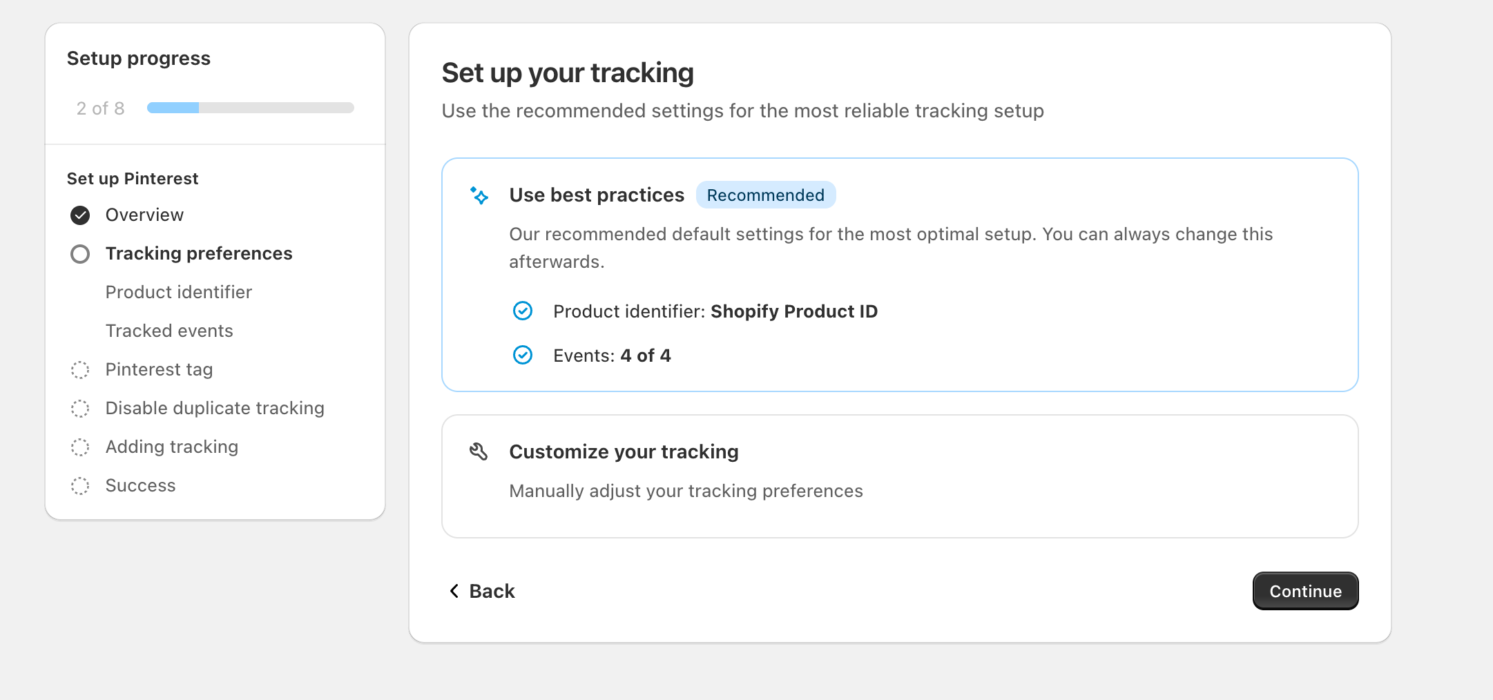 Next, select your tracking preferences, then click Continue. The recommended settings are pre-selected.