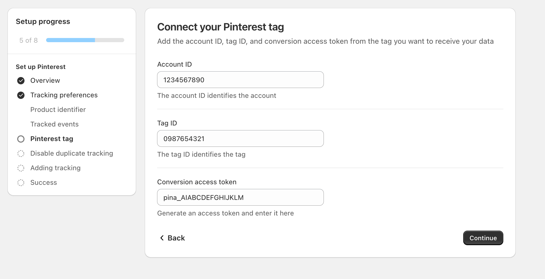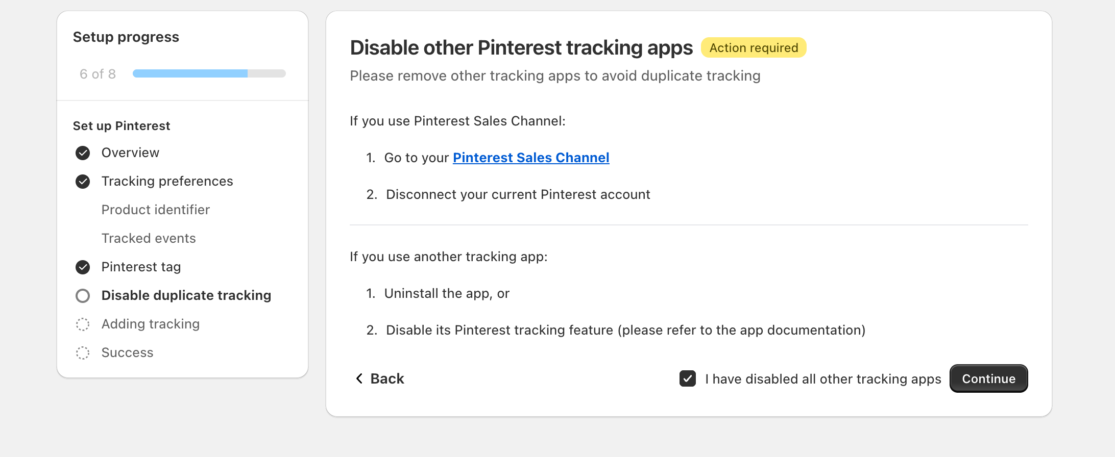 Lastly, make sure to disable any apps that could duplicate your tracking, including the native Pinterest Sales channel tracking. Once these steps are completed, tick the I have disabled all other tracking apps box and Continue.