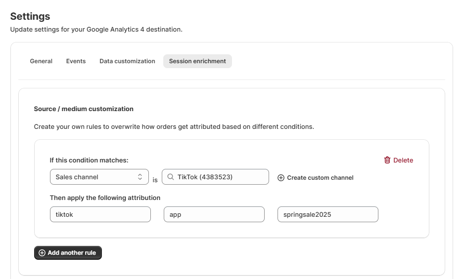 All the session enrichment settings are located in the Session enrichment tab, in the Google Analytics 4 connection settings.