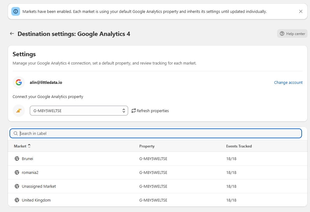 Littledata integrates with Shopify Markets so you can configure tracking and integrations per market across supported destinations like GA4 and Meta.